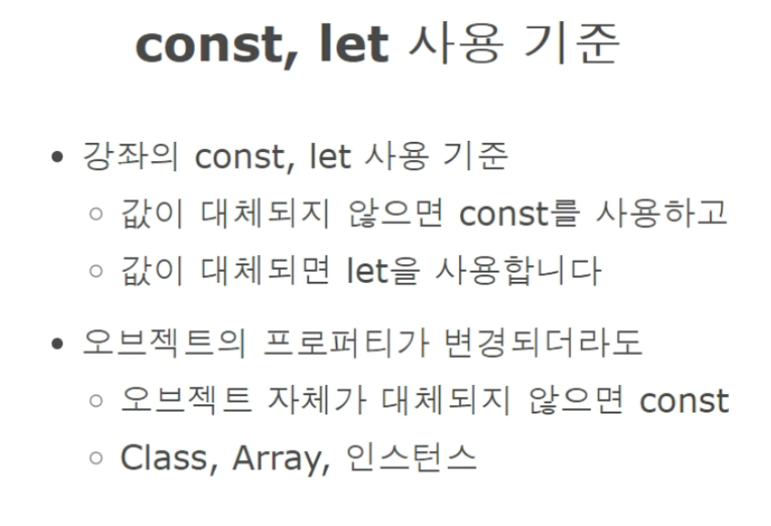 상수일 때에는 const, 변수일 때에는 let으로 선언해 주면 된다.