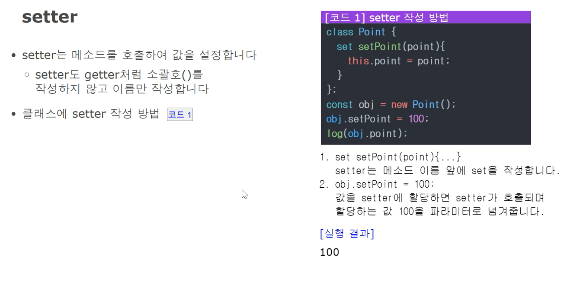 접근자 프로퍼티는 'getter(획득자)'와 ‘setter(설정자)’ 메서드로 표현된다. 객체 리터럴 안에서 getter와 setter 메서드는 get과 set으로 나타낼 수 있다.