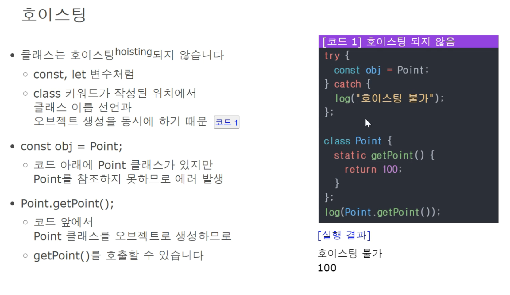 getter, setter, static 메소드, 호이스팅에 대해 배웠다.