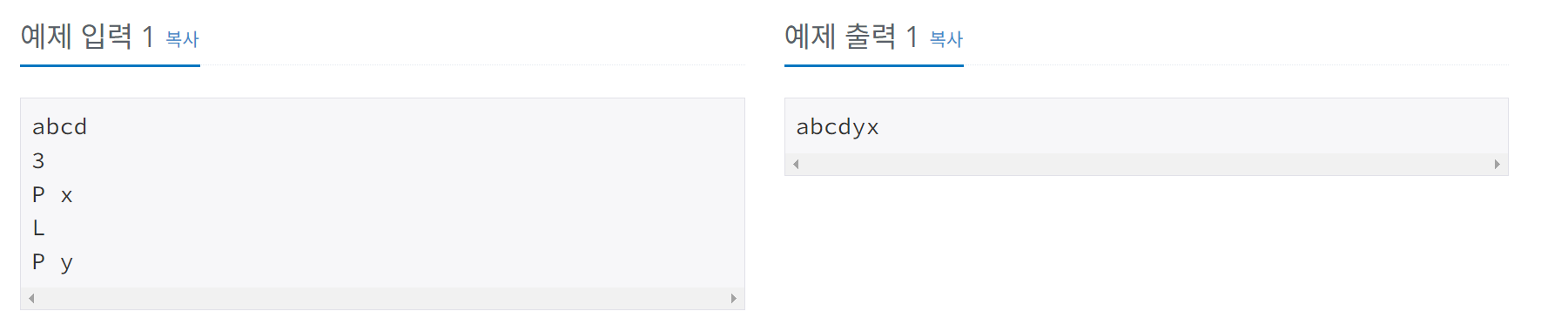 초기에 편집기에 입력되어 있는 문자열이 주어지고, 그 이후 입력한 명령어가 차례로 주어졌을 때, 모든 명령어를 수행하고 난 후 편집기에 입력되어 있는 문자열을 구하는 프로그램을 작성하시오. 단, 명령어가 수행되기 전에 커서는 문장의 맨 뒤에 위치하고 있다고 한다.