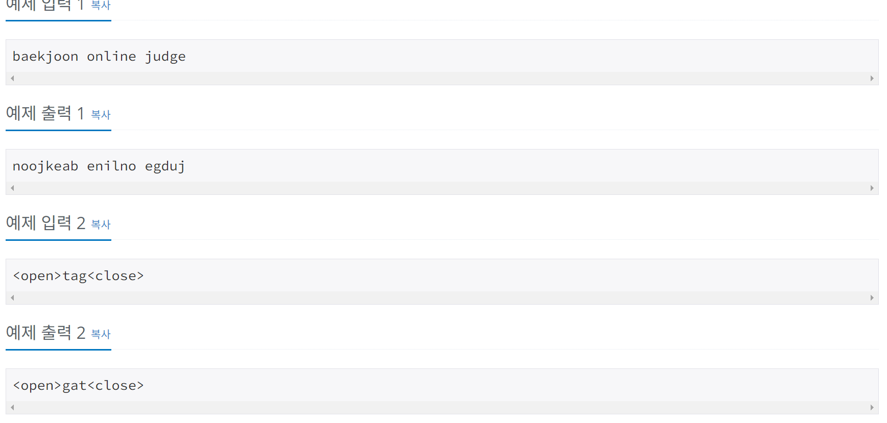 태그는 '<'로 시작해서 '>'로 끝나는 길이가 3 이상인 부분 문자열이고, '<'와 '>' 사이에는 알파벳 소문자와 공백만 있다. 단어는 알파벳 소문자와 숫자로 이루어진 부분 문자열이고, 연속하는 두 단어는 공백 하나로 구분한다. 태그는 단어가 아니며, 태그와 단어 사이에는 공백이 없다.