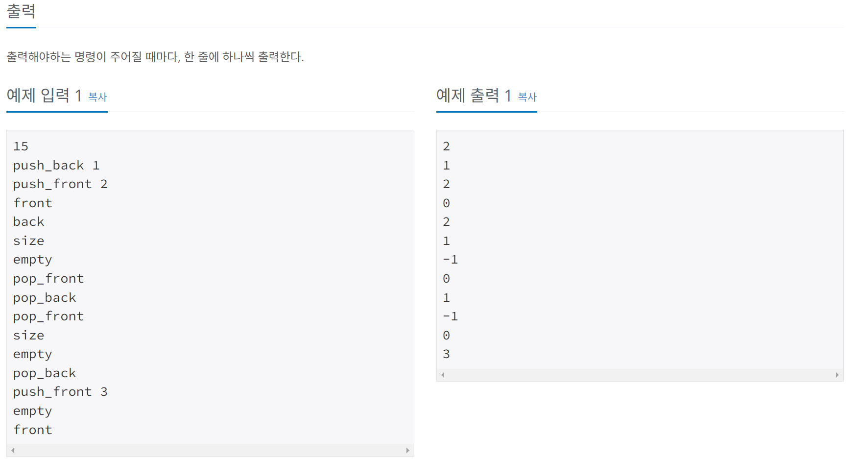 정수를 저장하는 덱(Deque)를 구현한 다음, 입력으로 주어지는 명령을 처리하는 프로그램을 작성하시오.