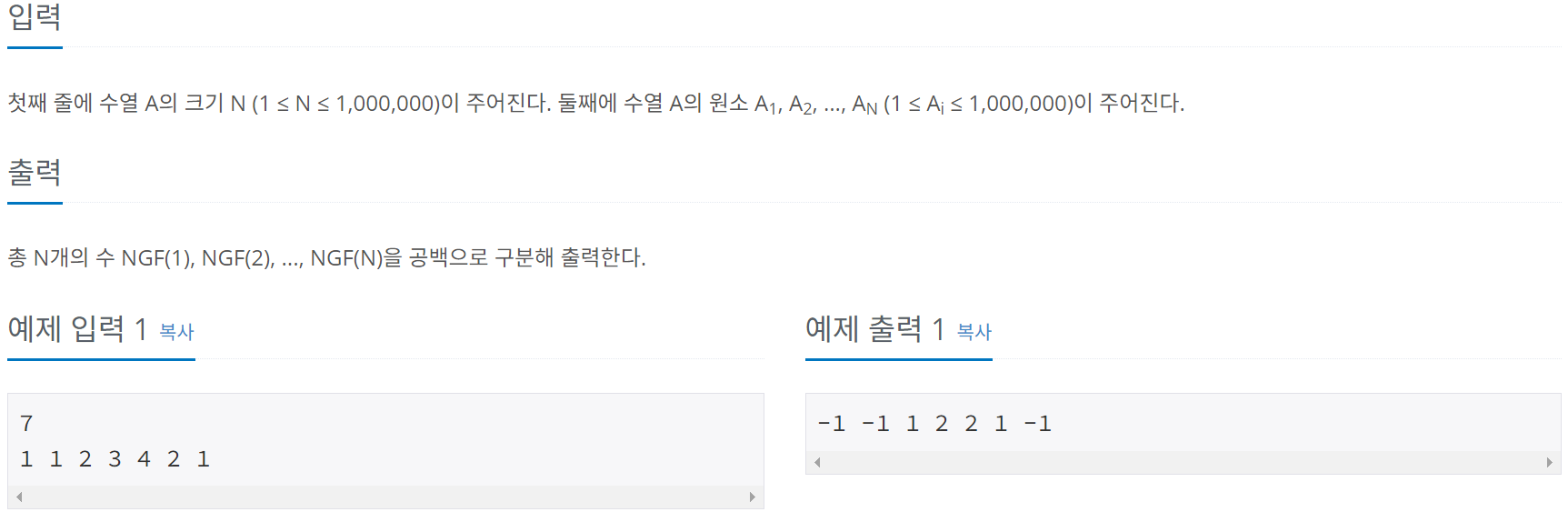 예를 들어, A = [1, 1, 2, 3, 4, 2, 1]인 경우 F(1) = 3, F(2) = 2, F(3) = 1, F(4) = 1이다. A1의 오른쪽에 있으면서 등장한 횟수가 3보다 큰 수는 없기 때문에, NGF(1) = -1이다. A3의 경우에는 A7이 오른쪽에 있으면서 F(A3=2) < F(A7=1) 이기 때문에, NGF(3) = 1이다. NGF(4) = 2, NGF(5) = 2, NGF(6) = 1 이다.