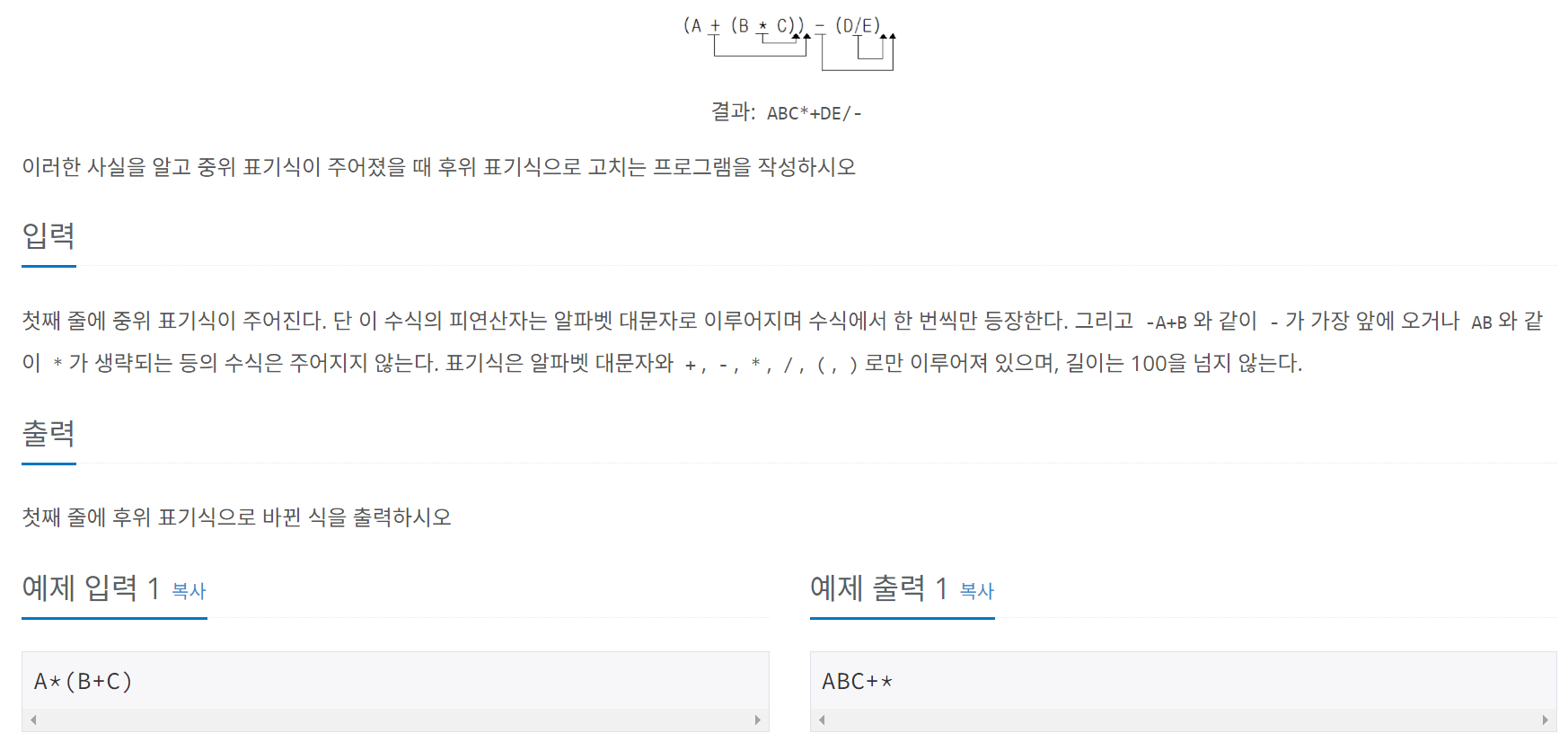 후위 표기법을 설명해주었던 문제이다. 사실 후위 표기법 2보다는 먼저 풀어야 하는 문제이지만, 알고리즘 기초 1/2의 순서로 풀어서 티스토리에는 2가 먼저 기입이 되었다.