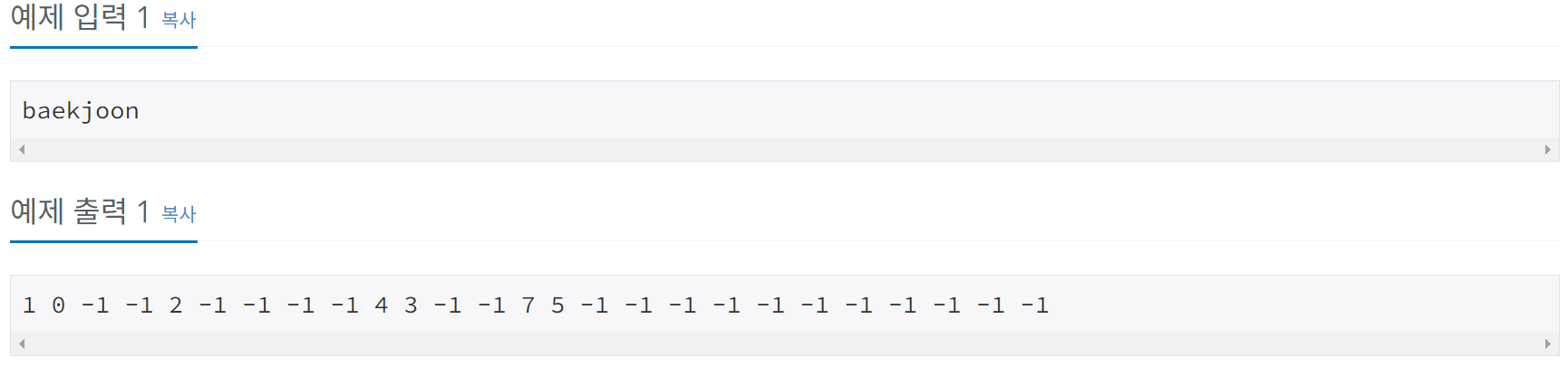 만약, 어떤 알파벳이 단어에 포함되어 있지 않다면 -1을 출력한다. 단어의 첫 번째 글자는 0번째 위치이고, 두 번째 글자는 1번째 위치이다.