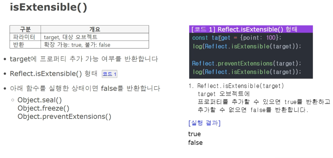 Object.isExtensible() 메서드는 객체가 확장 가능한지(객체에 새 속성을 추가할 수 있는지 여부)를 결정합니다.
