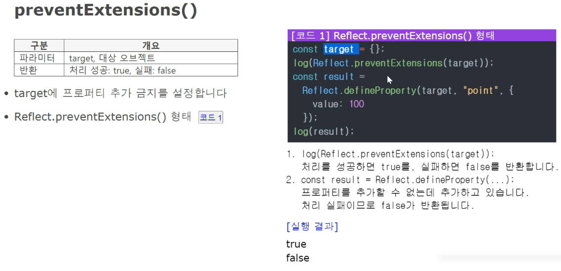 Object.preventExtensions() 메서드는 새로운 속성이 이제까지 객체에 추가되는 것을 방지합니다 (즉 객체의 장래 확장을 막습니다).