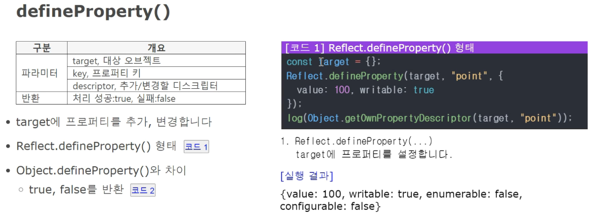 Object.defineProperty() 정적 메서드는 객체에 새로운 속성을 직접 정의하거나 이미 존재하는 속성을 수정한 후, 해당 객체를 반환합니다.