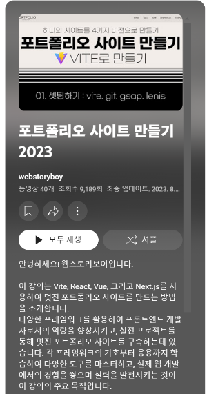 Tutorial/portfolio 포트폴리오 사이트 만들기 - React by @webs 2023. 08. 01. 01 포트폴리오 사이트 만들기 : 셋팅하기 난이도 중간 소스 다운로드 완성 화면 완성 코드 영상 보기 소개 안녕하세요! 웹스토리