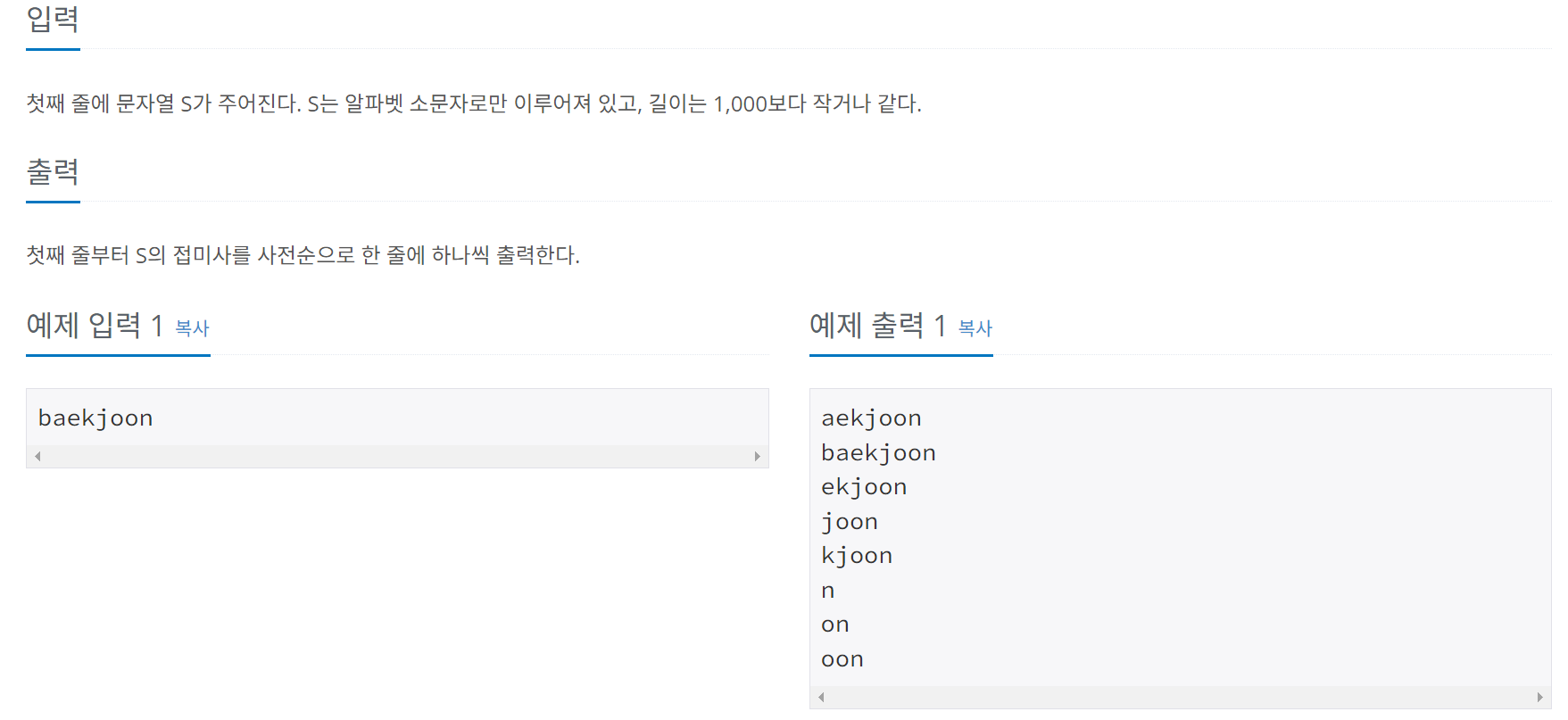baekjoon의 접미사는 baekjoon, aekjoon, ekjoon, kjoon, joon, oon, on, n 으로 총 8가지가 있고, 이를 사전순으로 정렬하면, aekjoon, baekjoon, ekjoon, joon, kjoon, n, on, oon이 된다.