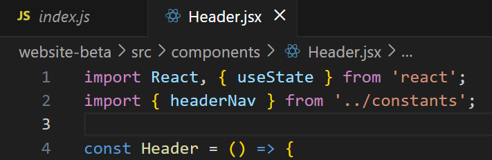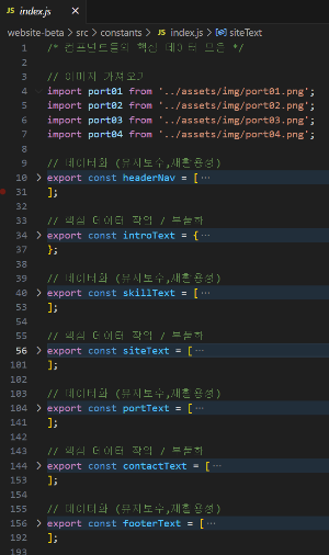 이건 해더 영역을 담당하는 부분이다. import를 하지만, 중간에 내가 가져오고 싶은 데이터의 "이름"을 중괄호로 묶어주어서 가져와야 한다. (jsx 문법) 이런 식으로 데이터를 주고받는다. 데이터를 수정하고 싶으면 index.js의 데이터를 수정해 주면 된다. (재사용성 증가)