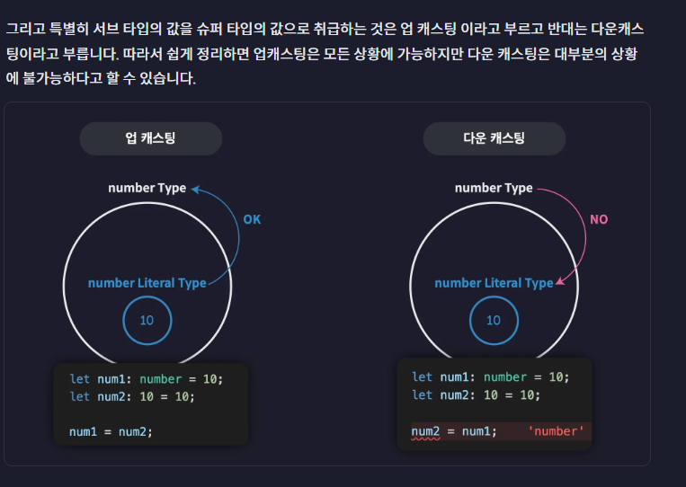 위 숫자 타입이 슈퍼타입(부모타입)으로 부를 수 있고, 밑의 리터널 타입이 서브타입(자식타입)으로 부를 수 있다.