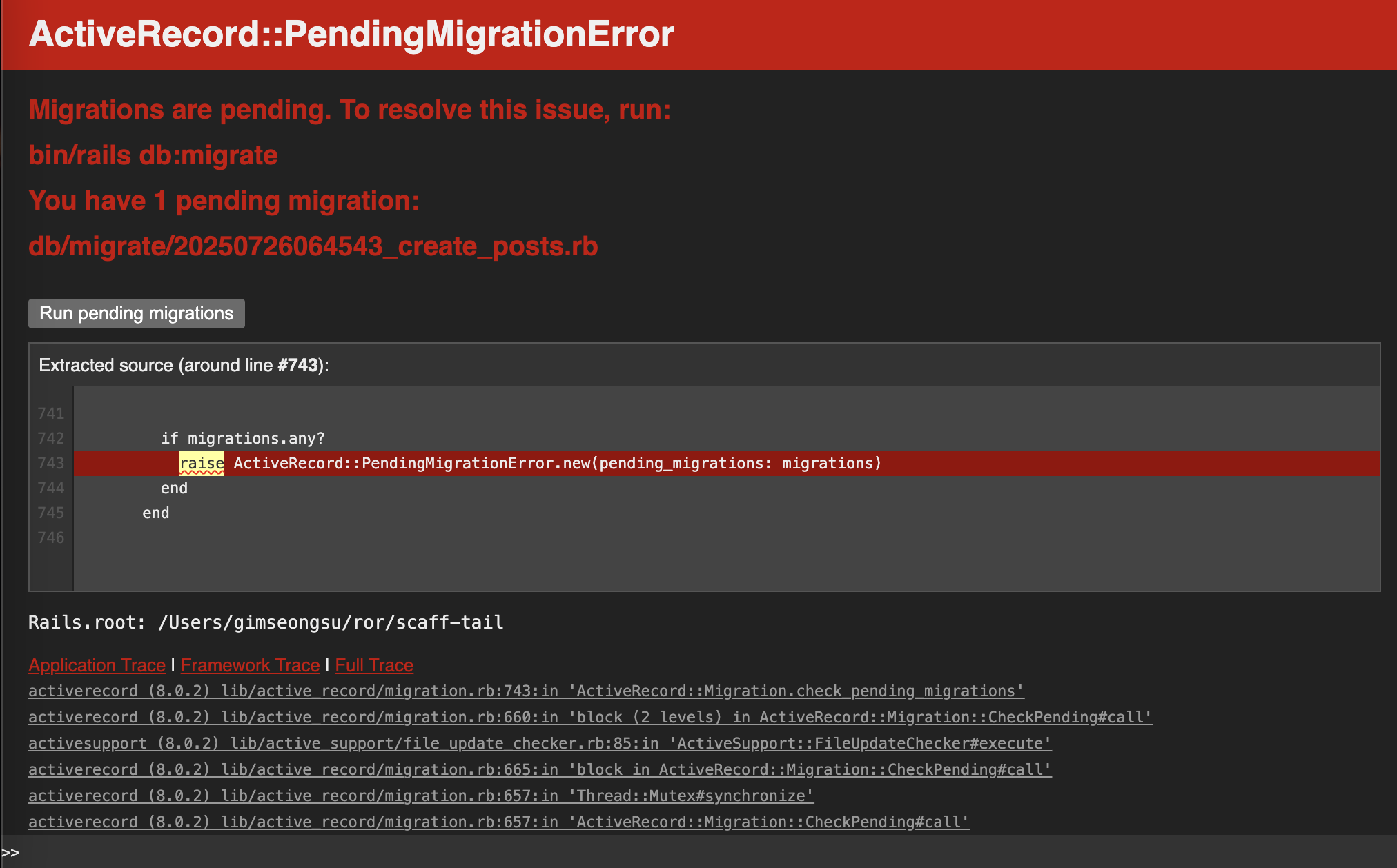 (이건 아직 우리 데이터베이스가 마이그레이션이 안되었기에 에러가 뜬 것!)
