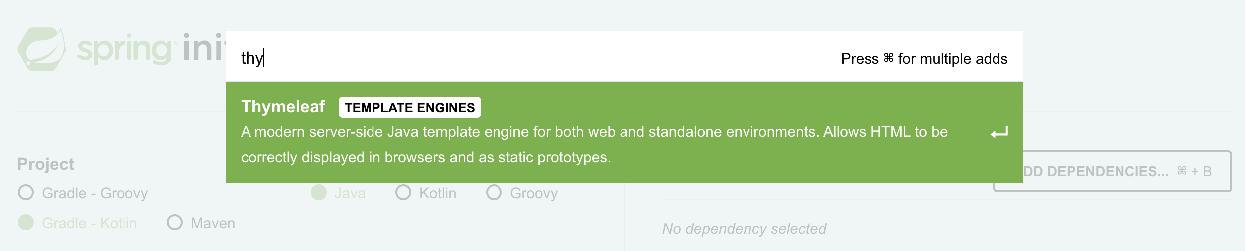 이 사이트에서 Dependencies 에 Thymeleaf를 검색해서 미리 세팅하는 방법이 존재한다.