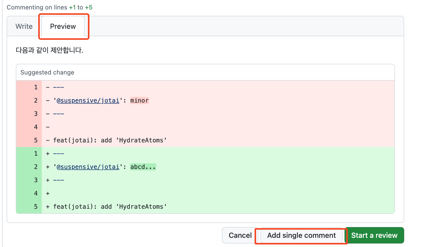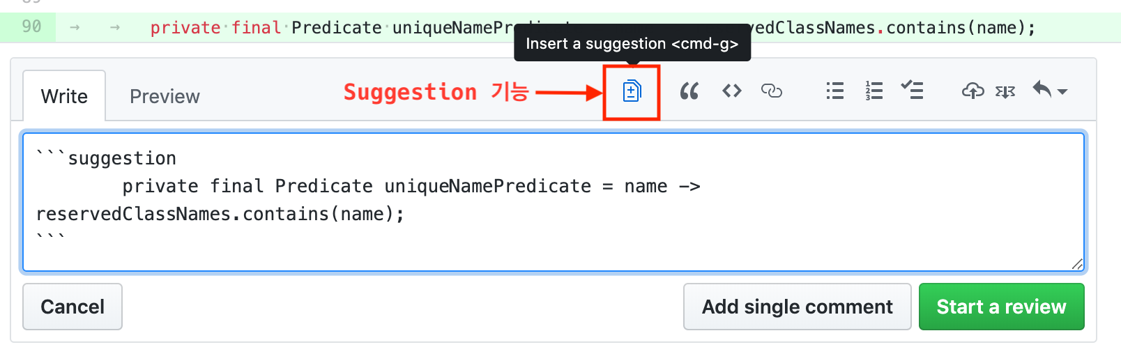 그러면 이렇게 뜨는데, 위 Add a suggestion를 누르고 본인 제안하고 싶은 코드를 작성한다.