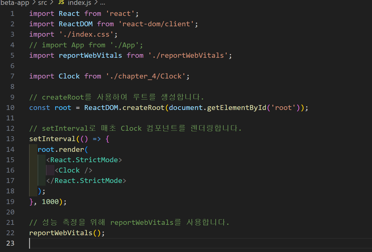 현재 코드를 보면, React 18에서 ReactDOM.createRoot를 사용하지 않고 ReactDOM.render를 사용하고 있기 때문에 오류가 발생하고 있습니다. ReactDOM.render는 React 18에서 제거되었고, 대신 ReactDOM.createRoot를 사용해야 합니다.