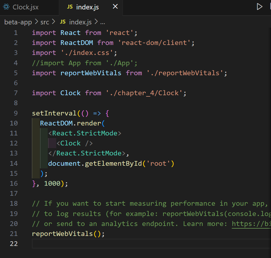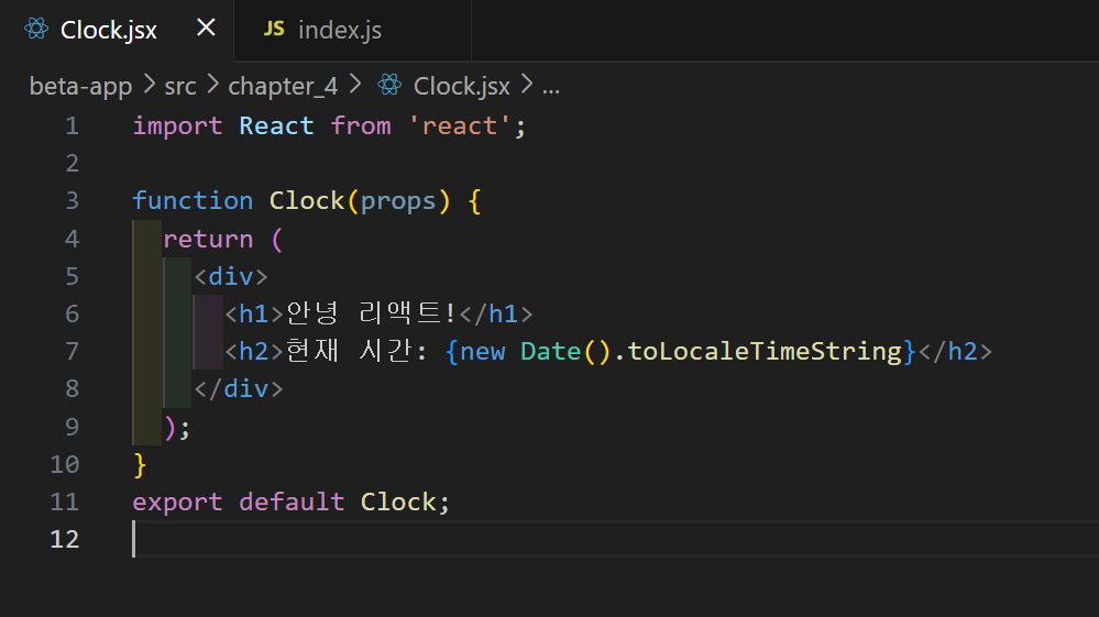 이건 Clock.jsx 코드이다. 이 코드도 잘못된 코드이다. 챗 지피티가 컴포넌트 부분이 잘못된 거 같다고 한다.