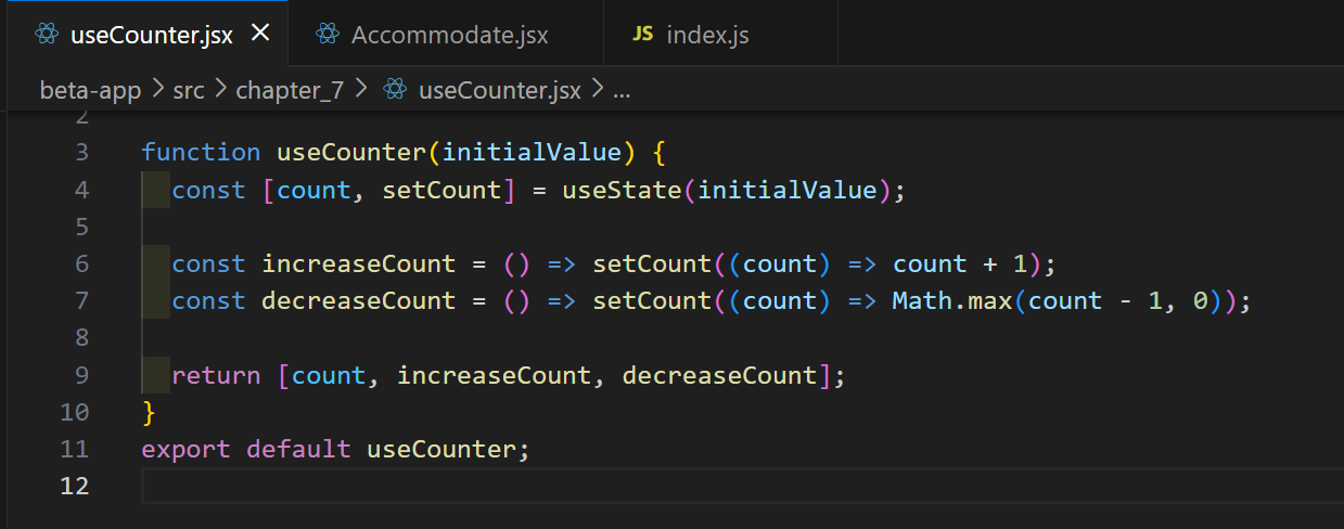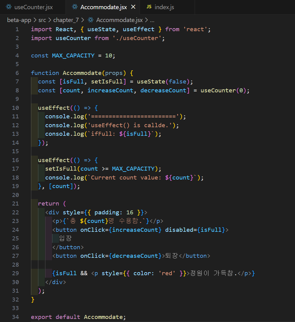 useState함수를 정의. 함수 배열에 count와 setCount를 정의해 준다. useCounter라는 함수 컴포넌트를 정의한다. 이후 Accommodate라는 함수 컴포넌트를 정의한다.