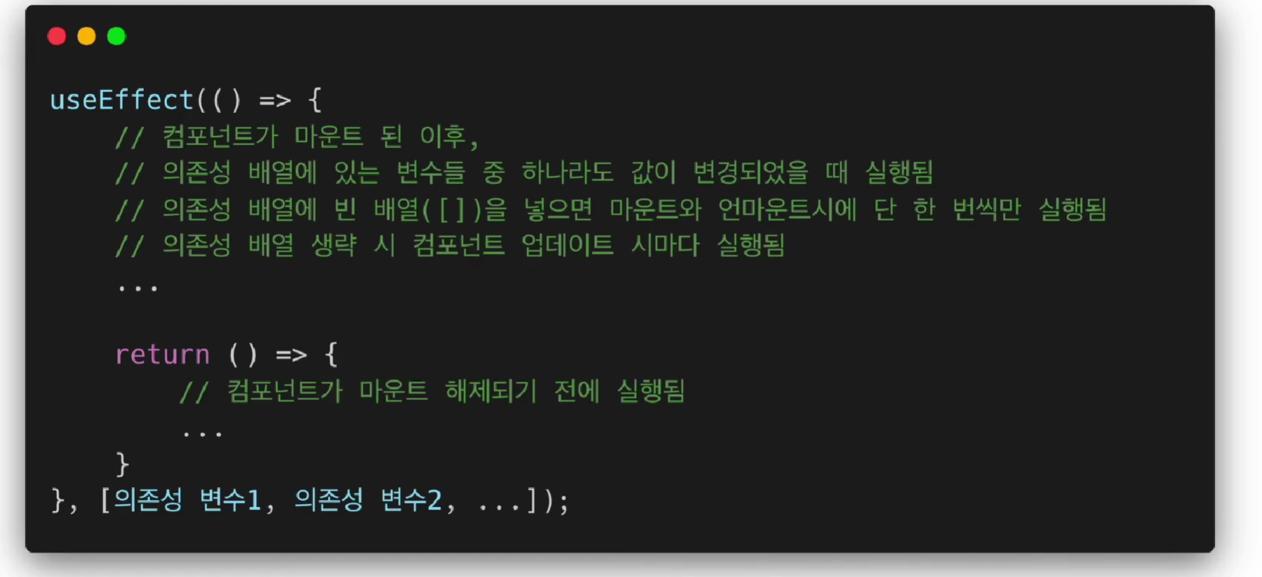 이때 의존성 배열을 생략할 수 있음. (컴포넌트가 업데이트될 때마다 호출됨)