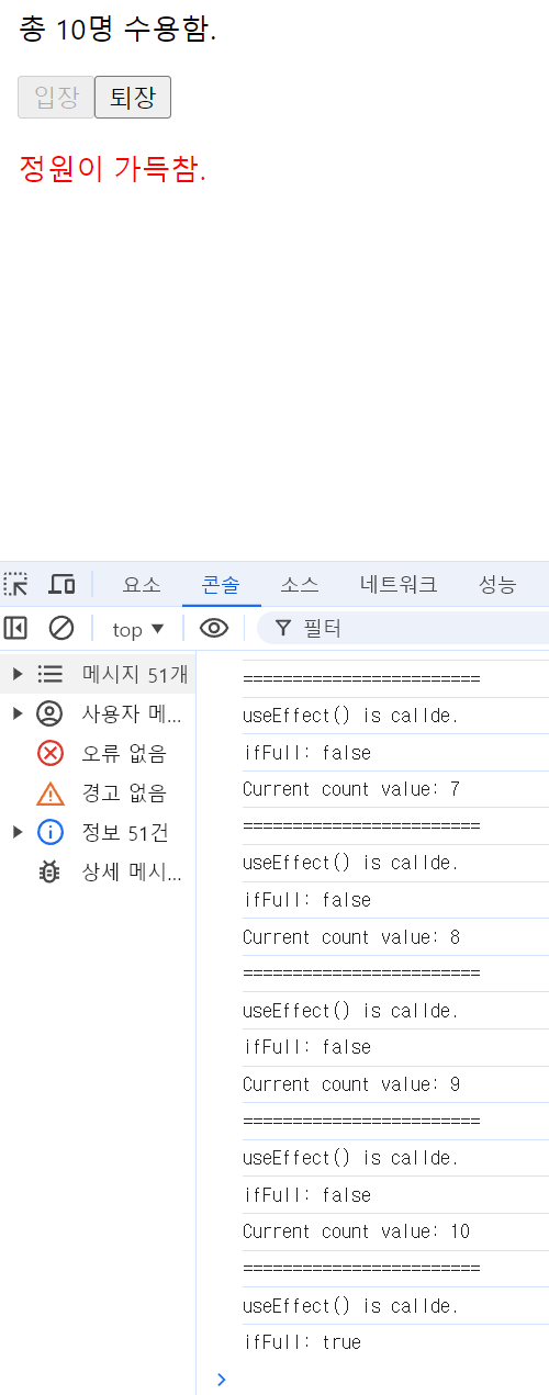 Math.max 함수를 이용해서 0 밑으로 내려가지 않게 정의해 두어서 0명일 때 퇴장을 눌러도 호출이 되지 않는다. (10명일 때도 마찬가지이다.)
