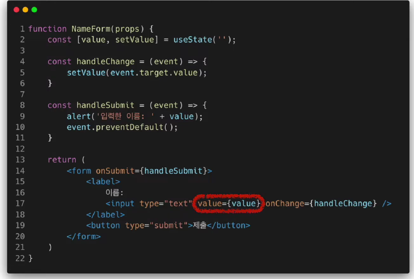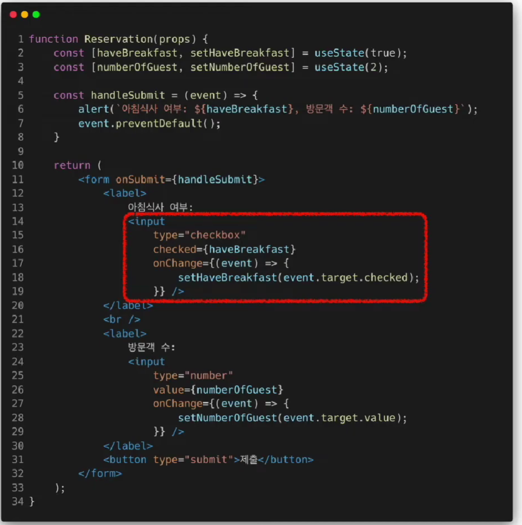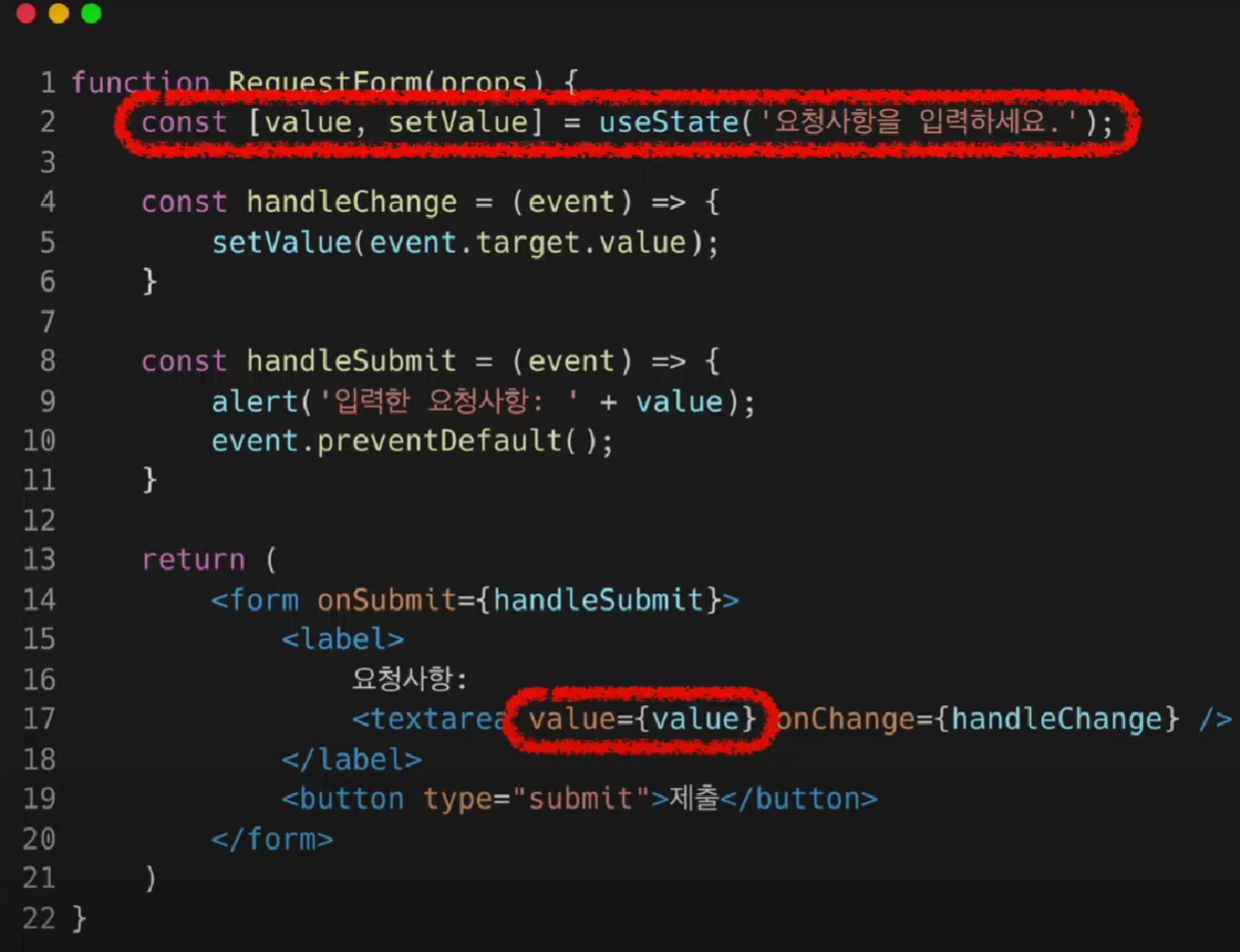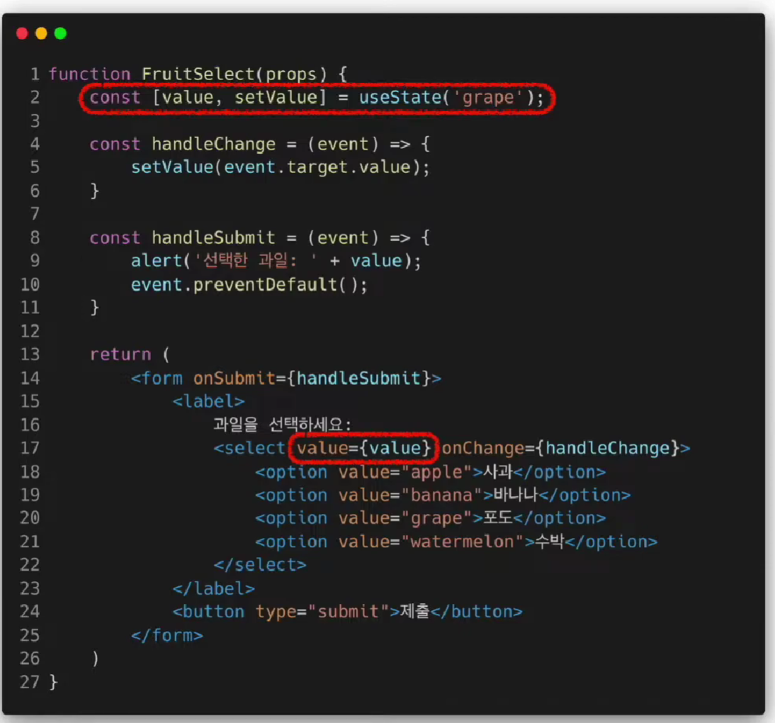 Controlled Component은 통제 받는 컴포넌트이다. 통제는 당연히 리액트가 한다.