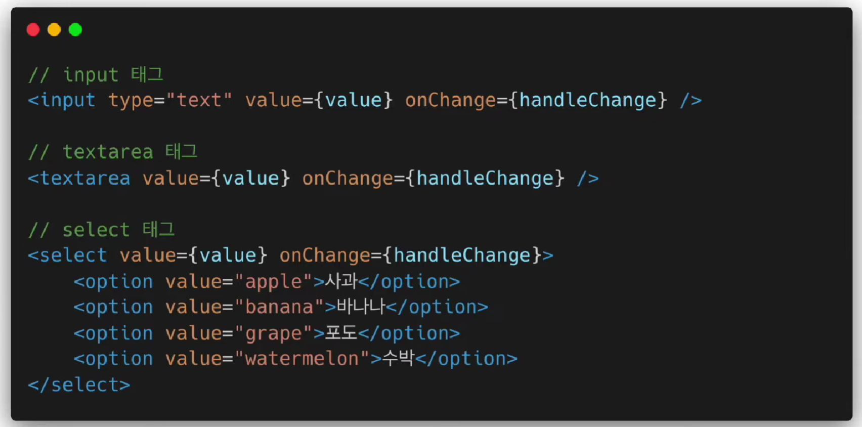 value를 정의하고 input 태그에 넣어준다. 이벤트 컨트롤도 비슷하게 실행한다.