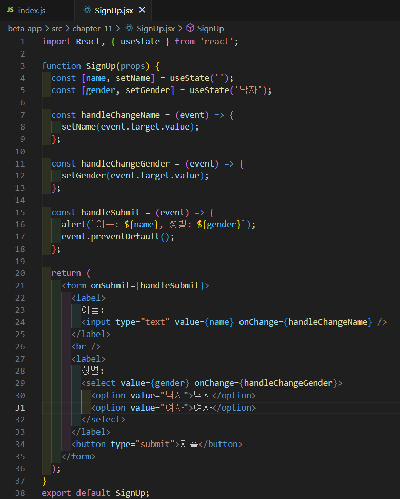 초기 값을 세팅해 줬다면 이후 form를 정의해 준다. form은 handleSumit를 객체로 가지고 있다. handleSumit은 이름과 성별을 받으면 팝업창에 띄어준다.