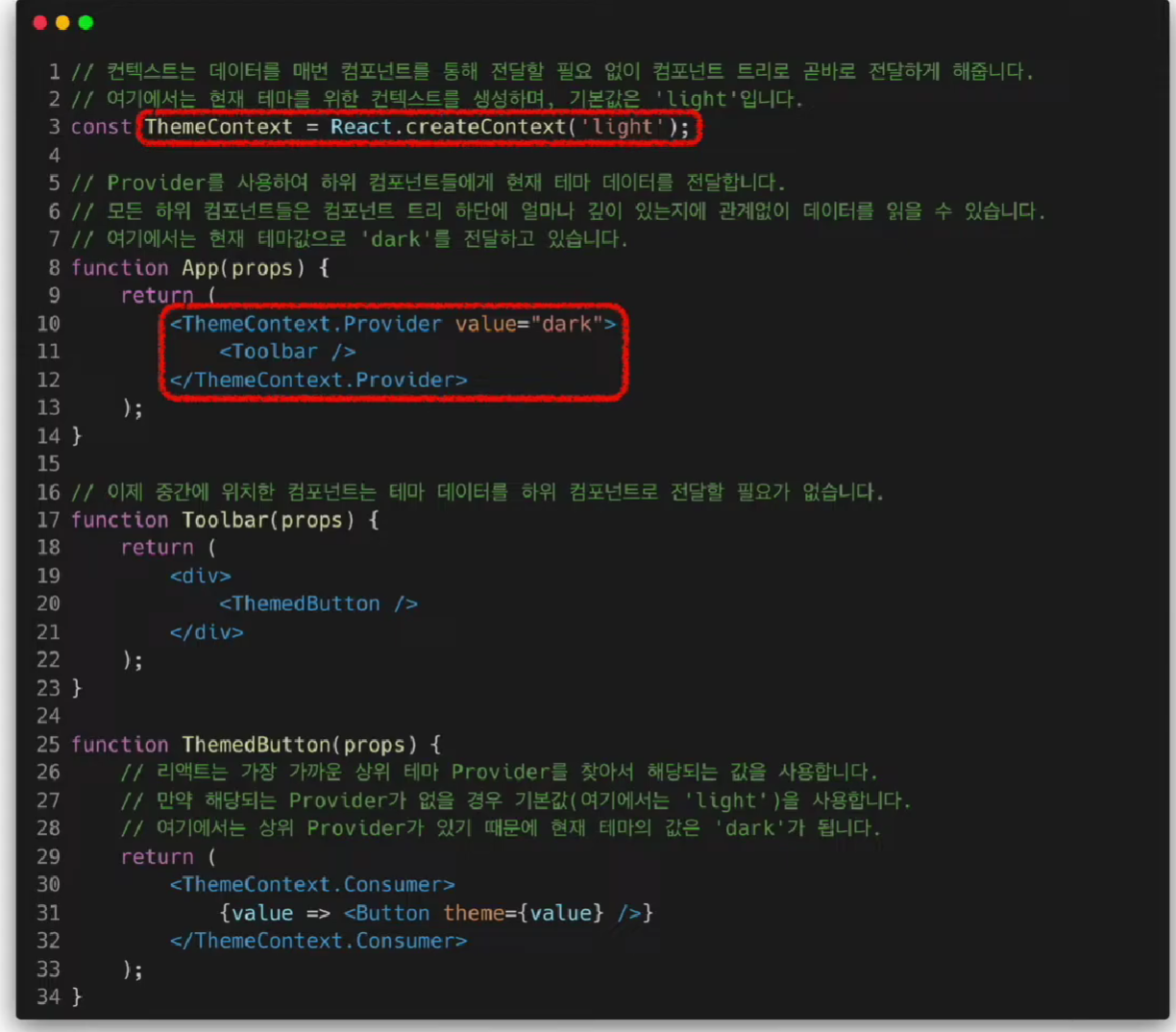 방법은 앞에서 배웠던 "훅"을 이용하는 것이다. 이 훅은 useContext()이다.
