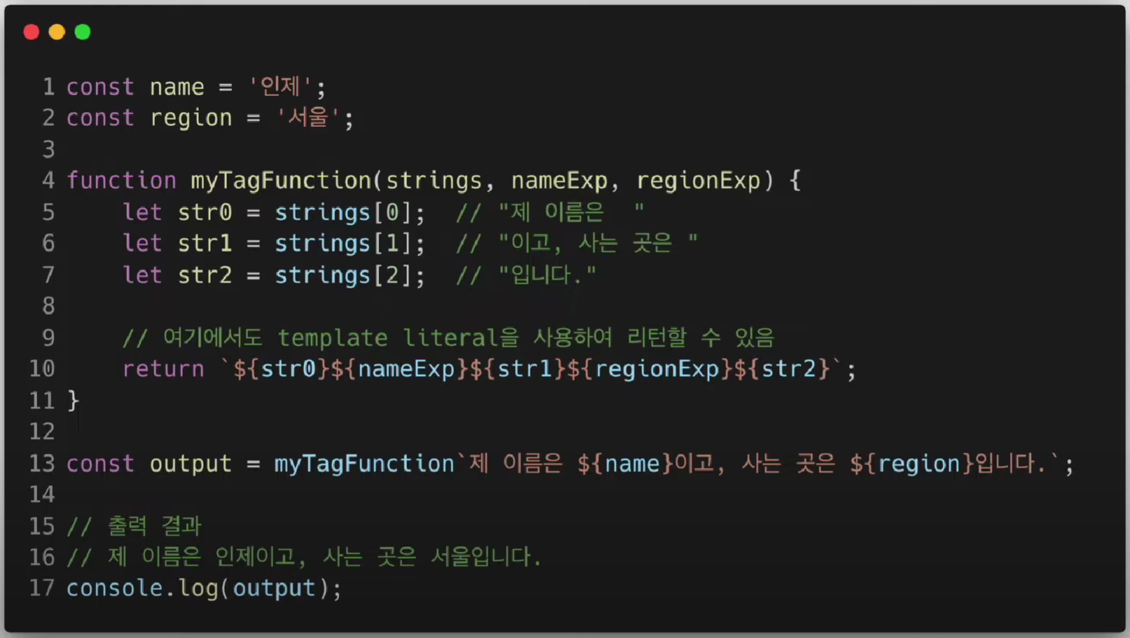 tagged template literal에 관한 실제적인 코드는 다음과 같이 쓰일 수 있다. ( tagged template literal은 자바스크립트에서 지원해 주는 문법이다.)
