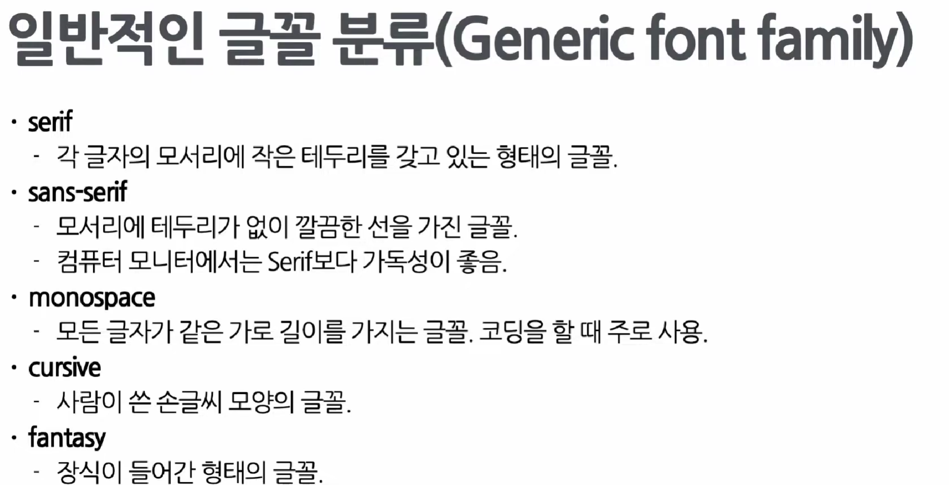 내가 쓰고 싶은 글꼴이 브라우저에서 잘 작동하지 않게 되면 "일반적인 글꼴 분류"로 작성된다.