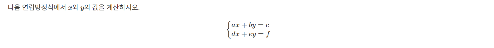 x와 y를 구하려면 연립방정식을 구하면 된다. 구하는 법은 되게 쉽다. x를 구하고 싶으면 y값을 동일하게 만들고 빼주면 되며, y를 구하고 싶으면 x값을 동일하게 만들어주고 빼면 된다. 어차피 정수들은 숫자로 입력이 될 것이라 상관없다.
