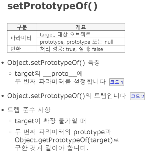 정적 메서드는 지정된 객체의 Object.setPrototypeOf()프로토타입(즉, 내부 속성)을 다른 객체로 설정합니다.