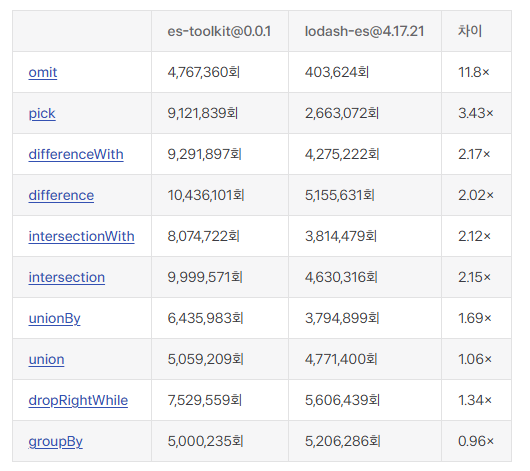 lodash와 같은 다른 라이브러리와 비교했을 때, es-toolkit은 같은 함수 기준 최대 97% 작은 번들 사이즈를 제공하며, 2~3배 빠른 속도로 동작한다.
