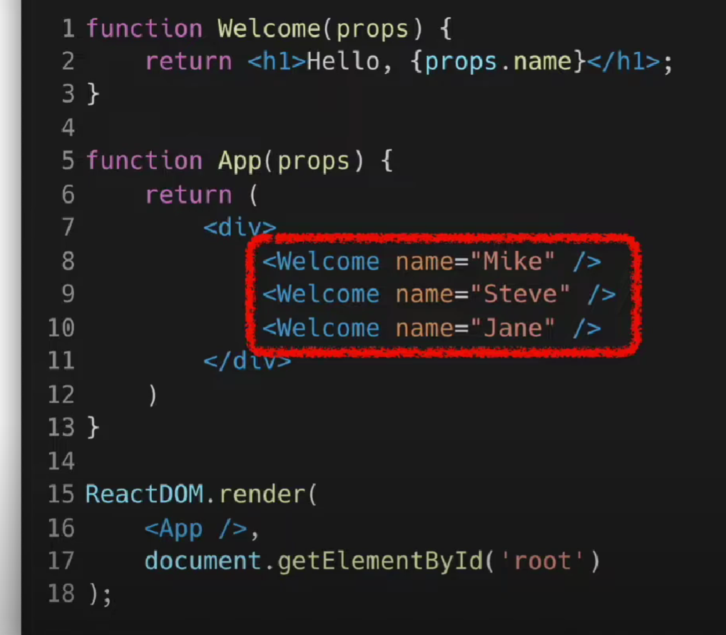 위의 코드는 dic 태그로 인식 (왜냐면 소문자로 시작하니깐) / 반대로 웰컴은 대문자로 시작한다. 이러면 리액트는 리액트 컴포넌트라고 인식한다. 소문자로 시작하게 만들 수는 있지만.... 진짜 웬만하면 대문자를 쓰자.