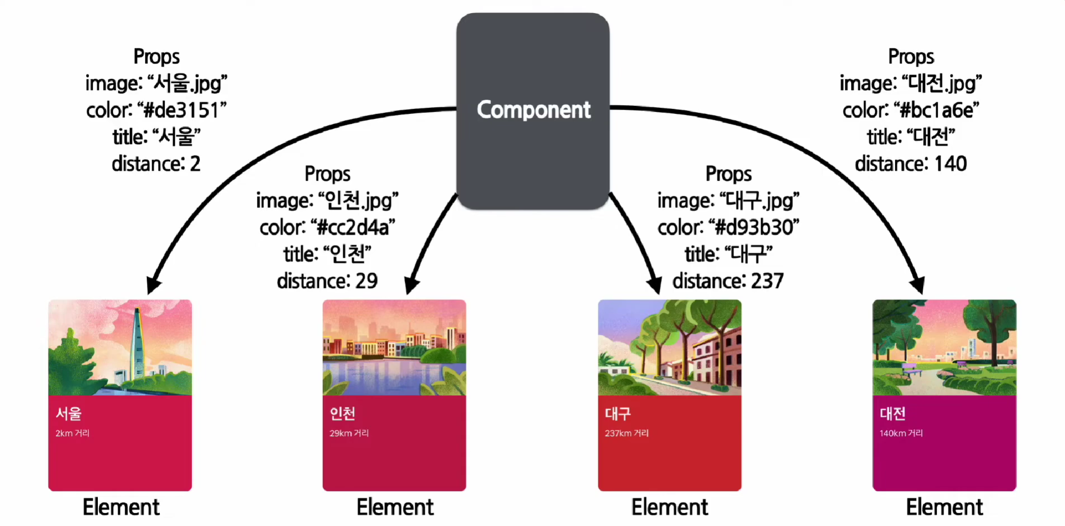 예시를 들어서 설명하자면 다음과 같은 그림이 된다. 컴포넌트가 붕어빵 틀이라면 프랍스는 "재료"가 되는 셈. 틀은 같지만 속도 다르고 색깔이 다른 것이다.