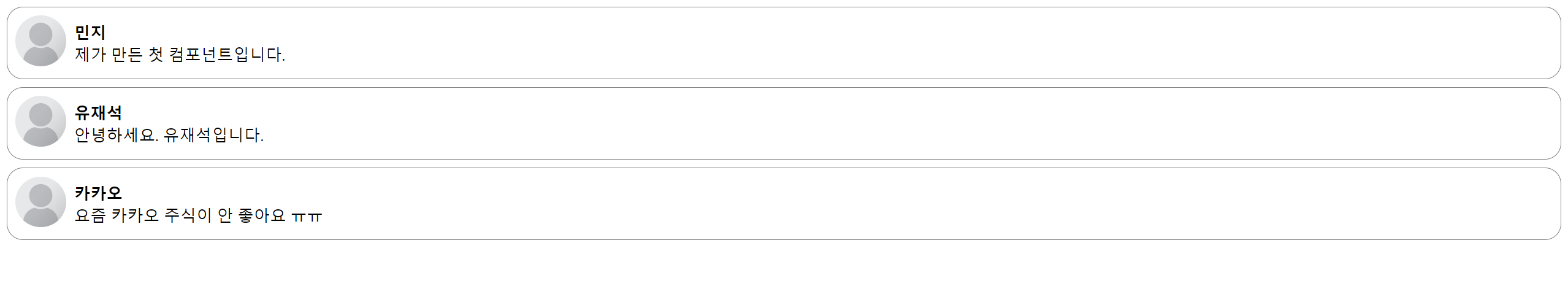 이 상태에서 props를 추가해 주면 댓글이 계속해서 추가가 된다. 왜 그럴까? 간단하다. 컴포넌트라는 "틀"은 계속해서 똑같이 찍히고 그 안의 재료만 여러 개가 추가가 된 거기 때문이다.