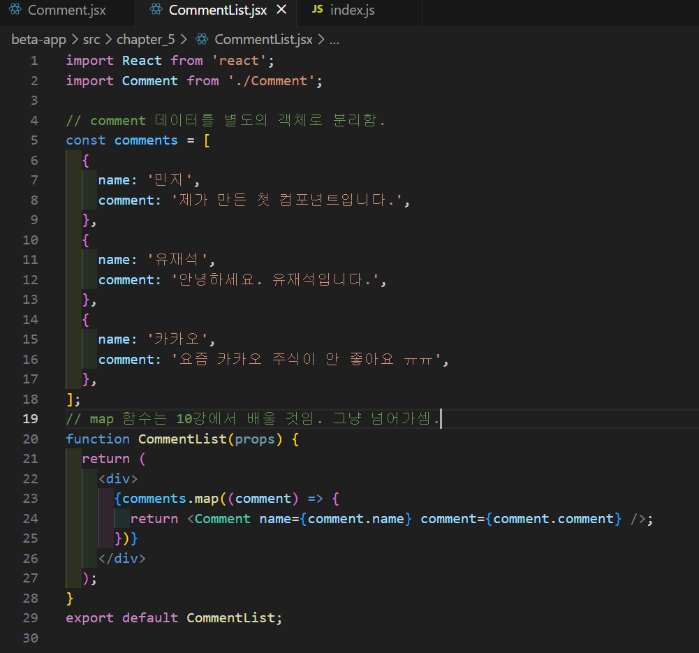 이 코드는 map이라는 함수로 commet 데이터를 따로 별도의 객체로 분리한 것이다. map 함수는 10강에서 배울 것이니 그냥 이런 것이 있다고 넘어가면 된다. commet 데이터를 commets에 담았고, 이 안의 객체 값을 추가하고 바꾸면 된다.