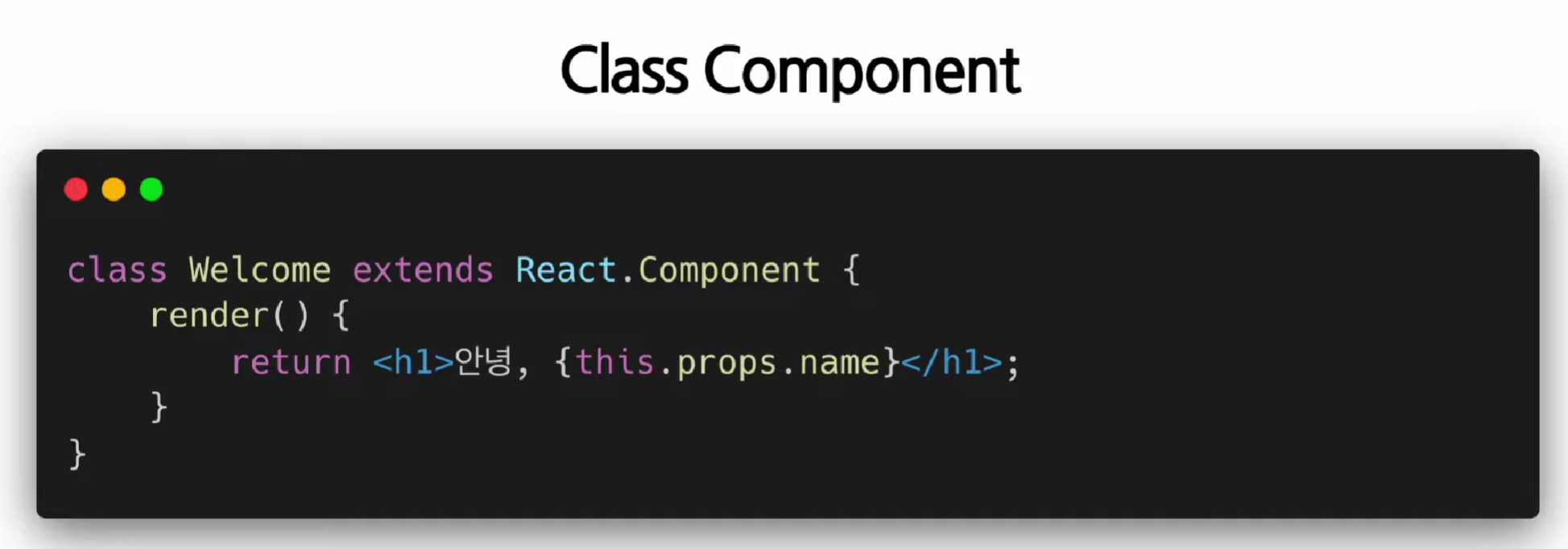 컴포넌트는 클래스 컴포넌트 , 함수 컴포넌트로 나뉜다. 그러나 시간이 지나고 발전하면서 함수 컴포넌트를 개선해서 쓰였고, 이 함수 컴포넌트를 개선하는 과정에서 "Hook"이라는 기술을 만들게 되었다. 이 부분은 뒤에서 배울 것이고, 대부분 리액트에서는 훅을 이용한다.
