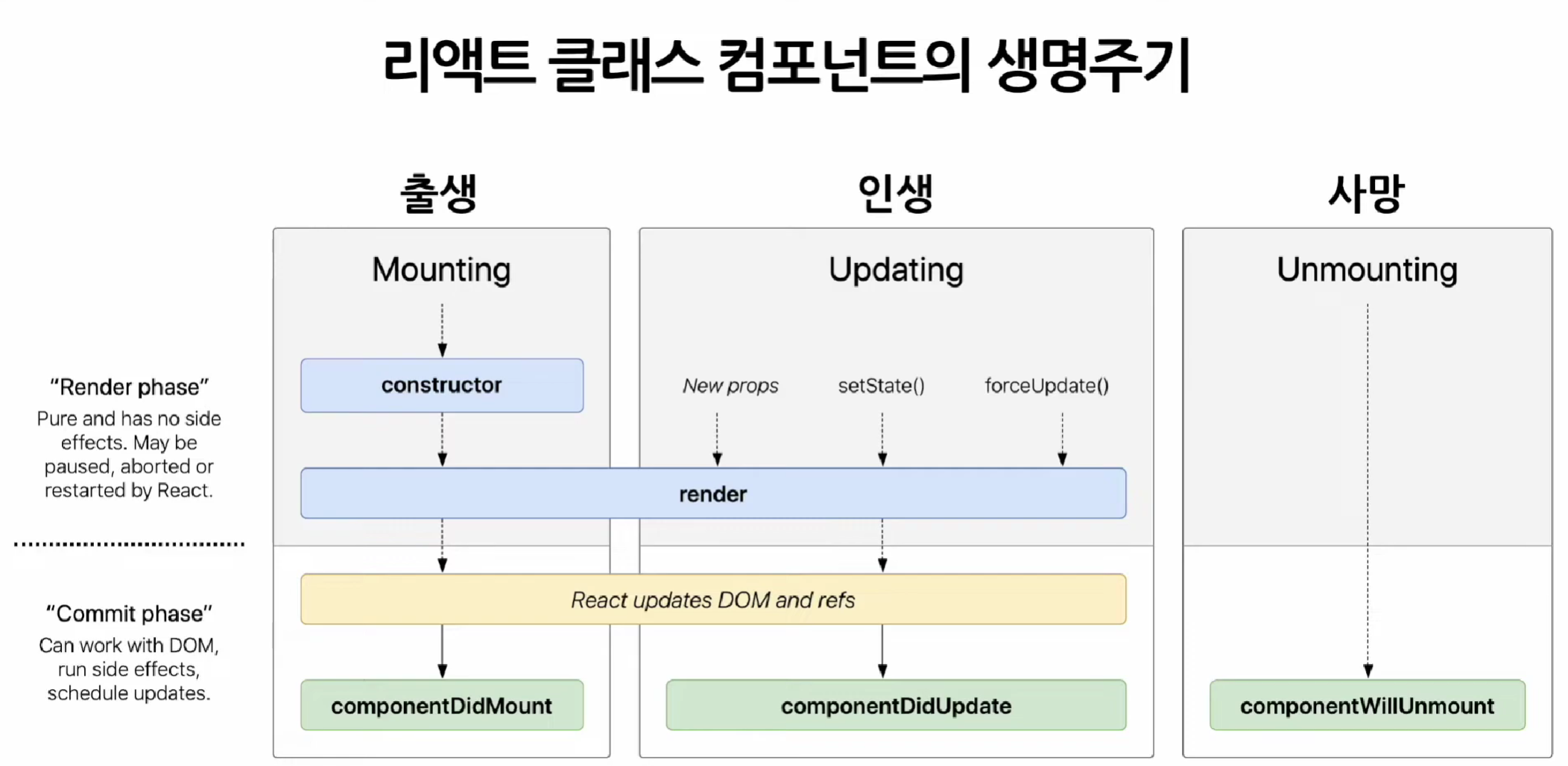 리액트 컴포넌트도 사람처럼 생명주기가 있고, 출생해서 쭉 살아가다 사망하는 것과 같은 이치다.