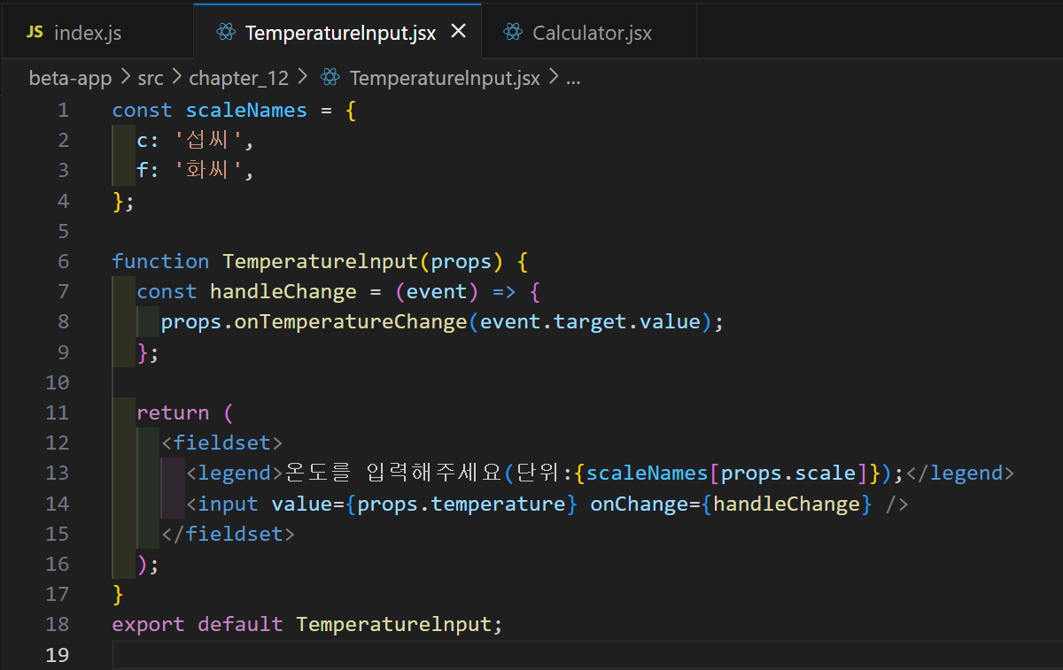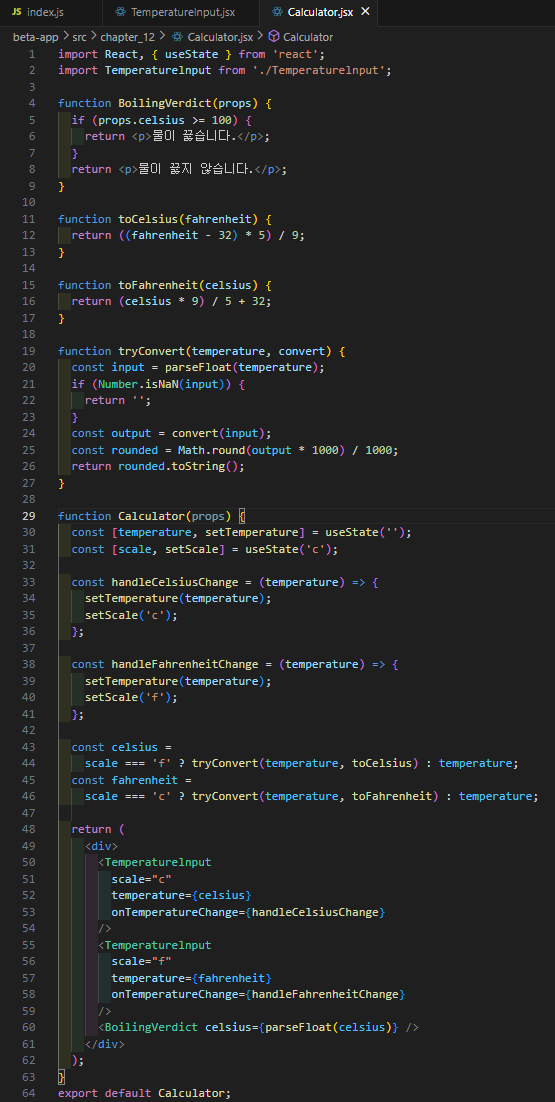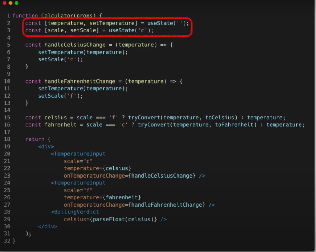 상위 컴포넌트 안에 값을 하위 컴포넌트가 받아서 공유한다. (온도는 25 , 스케일은 c)