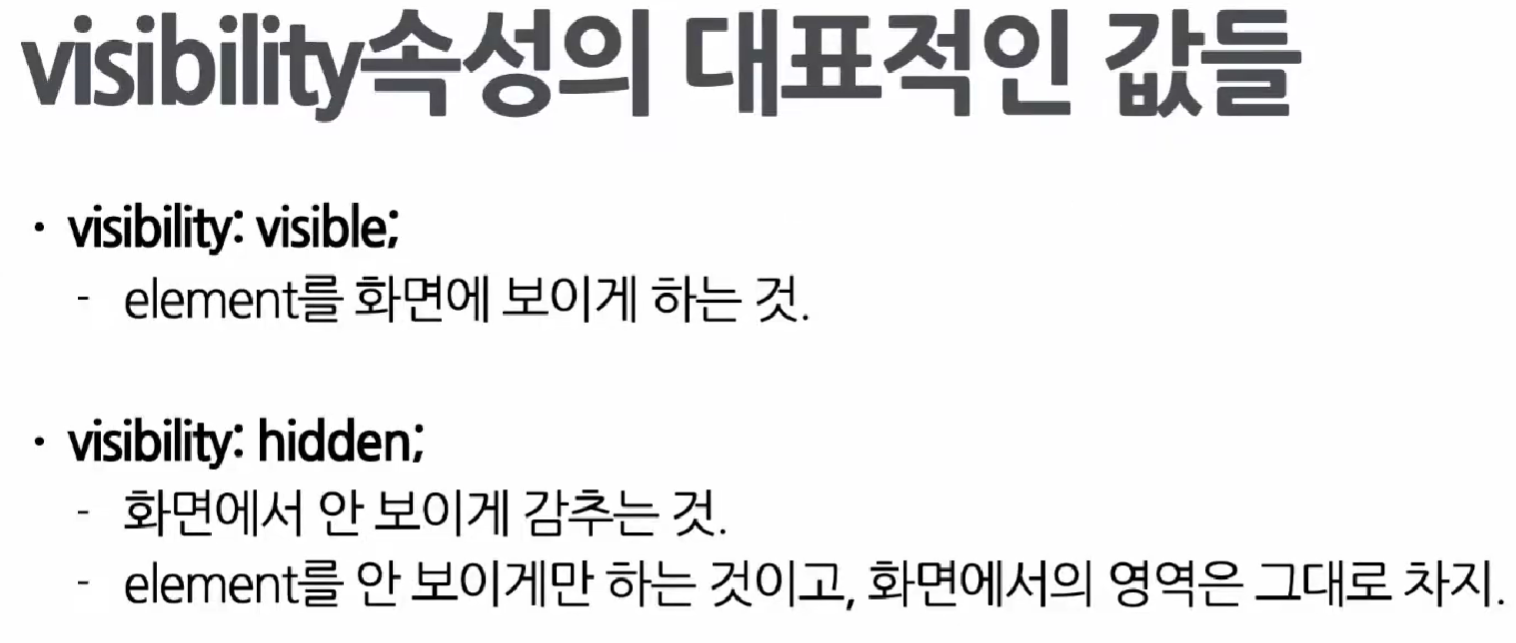 visibility은 화면에서 보이게 하거나 아님 안 보이게 도와주는 속성이다.